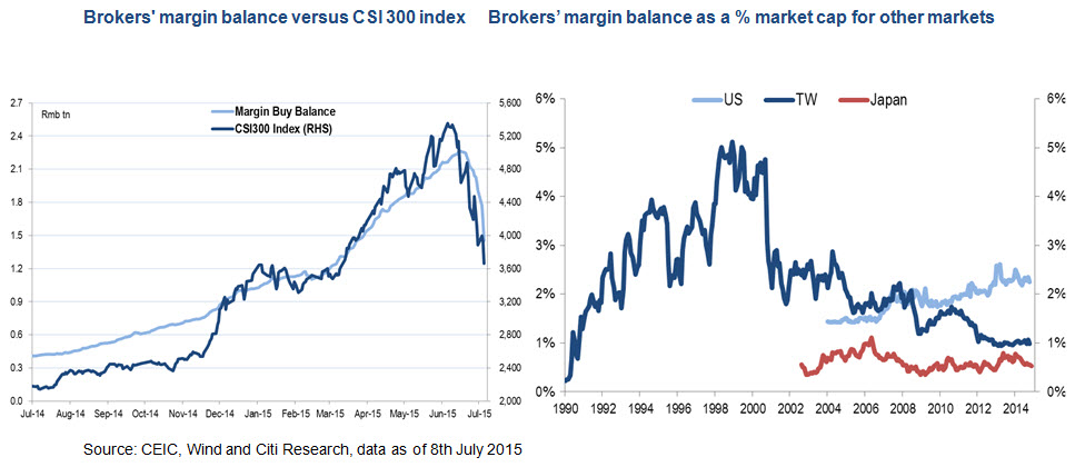 The official margin positions have so far come down to RMB 1.46 trillion (as of 8th July) from RMB 2.2 trillion. Although leverage amounts from other informal financing channels is not certain, we believe a big portion of this has probably already been cleared given the recent market plunge and high leverage ratios (3-4x gear) of this lending.