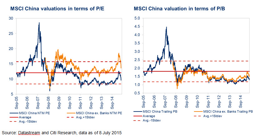 In the near term, the MSCI China will continue to be influenced by the A-share market sentiment as well as external factors, including a potential “Grexit “ in the eurozone and the potential interest rate hike by the US Federal Reserve. However, we see more value in Hong Kong-listed China stocks for longer-term investors as their valuation has become attractive after the recent correction. MSCI China now trades at 1.3x trailing P/B, close to one standard deviation from its 10-year average.