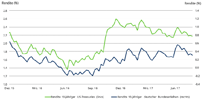 Anders als in den vergangenen Monaten ist der „Trump-Reflationshandel1“ nun abgeflaut, und die Anleiherenditen nähern sich nun wieder ihrem Stand vor dem Trump-Sieg. Die nachstehende Grafik zeigt die Rückkehr der Renditen zehnjähriger US-Treasuries und deutscher Bundesanleihen auf ihren Stand vor der US-Wahl. (1 Dies bezieht sich auf die Erwartung, dass US-Präsident Trump Maßnahmen zur Förderung der wirtschaftlichen Nachfrage durchsetzen wird und Anleger Vermögenswerte kaufen werden, die von diesen Maßnahmen profitieren dürften.)
