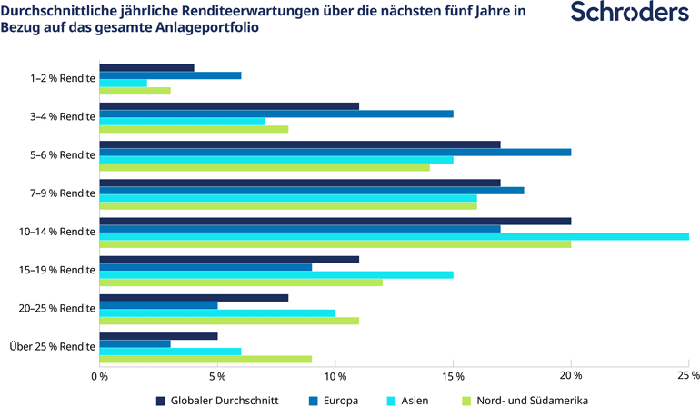 Die Schroders Institutional Investor Study, ein separates Projekt, hat ebenfalls stark abweichende Einschätzungen bei professionellen Investoren rund um den Globus erfasst, die in den nächsten fünf Jahren von jährlichen Renditen von knapp über 5 % ausgehen.