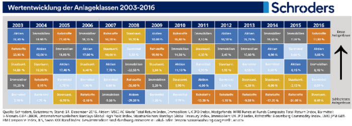Quelle: Schroders, Datastream; Stand: 31. Dezember 2016. Aktien: MSCI AC World Total Return Index, Immobilien: UK IPD Index, Barmittel: 3-Monats-GBP-LIBOR, Unternehmensanleihen: Barclays Global High Yield Index, Staatsanleihen: Barclays Global Treasury Index, Immobilien: UK IPD Index, Rohstoffe: Bloomberg Commodity Index. Nur zu Informationszwecken. Das bereitgestellte Material stellt keine wie auch immer geartete Beratung dar. Die hierin enthaltenen Angaben werden als verlässlich erachtet; Schroders übernimmt jedoch keine Gewähr für ihre Vollständigkeit oder Richtigkeit.