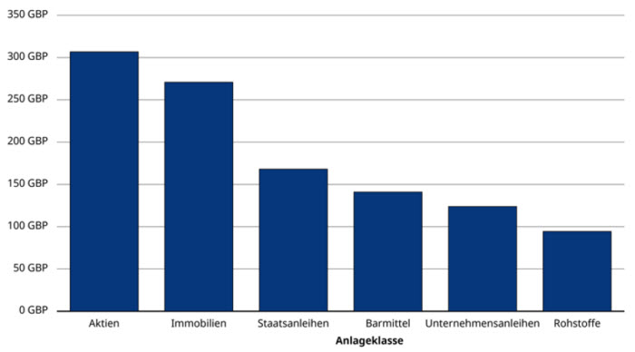 „Aktien“ bezieht sich auf die Weltaktienmärkte gemessen am MSCI World Total Return Index. „Staatsanl.“ bezieht sich auf die Wertentwicklung von Staatsanleihen weltweit und „Immobilien“ auf die Erträge britischer Gewerbeimmobilien. Nähere Einzelheiten zu den für die Anlageklassen jeweils verwendeten Indizes finden sich am Ende der Tabelle.