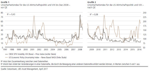 Wie Grafik 1 zeigt, gab es einen relativ robusten empirischen Zusammenhang zwischen dem Unsicherheitsindex für die US-Wirtschaftspolitik und der impliziten Volatilität am US-Aktienmarkt, bevor die US-Notenbank mit ihrem QE-Programm begann. Dieser Zusammenhang erscheint absolut begründbar angesichts der möglichen Auswirkungen politischer Maßnahmen auf das Nachfragewachstum und die Ertragskraft der Unternehmen. Seit dem Start von QE (Grafik 2) ist die implizite Volatilität am US-Aktienmarkt jedoch niedrig geblieben, und dies trotz stark erhöhter wirtschaftspolitischer Unsicherheit, wie sie jetzt in den USA und weltweit herrscht.