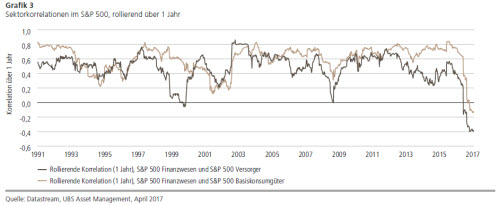 Die Sektorkorrelationen im US-Aktien-markt sind seit dem Wahlerfolg von Präsident Trump stark gefallen, nachdem Investoren die Aussichten auf mehr Wachstum und Inflation über den so- genannten „Reflationshandel“ erst angenommen, dann wieder infrage gestellt hatten. In einigen Fällen sind die Sektorbeziehungen zusammengebrochen. Auch die zuvor starken Korrelationen auf Länderebene in den globalen Aktien-märkten gehen zurück, und Investoren diskutieren wieder stärker über funda-mentale Gewinndaten, anstatt sich völlig auf die künftige Notenbankpolitik zu konzentrieren.