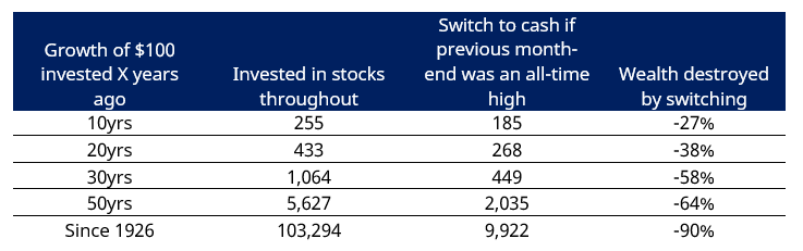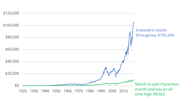 Daten Januar 1926 bis Dezember 2024. Die Y-Achse ist logarithmisch skaliert. Die Umschaltstrategie wechselt für den nächsten Monat in Bargeld, wenn das Ende des Vormonats ein Allzeithoch war, und investiert in Aktien, wenn dies nicht der Fall war. Die Ergebnisse enthalten keine Transaktionskosten. Aktien werden durch den Ibbotson® SBBI® US Large-Cap Stocks Index repräsentiert, Bargeld durch Ibbotson® US (30-Tage-) Schatzwechsel. Quelle: Morningstar Direct, abgerufen über das CFA Institute und Schroders.