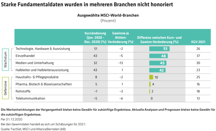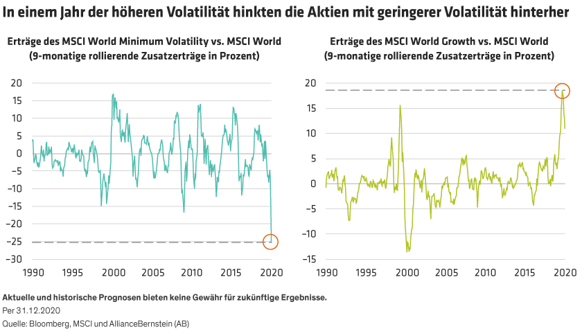 Durch die Hoffnung auf Impfstoffe wurden im späteren Jahresverlauf die Aktienkurse in Sektoren in die Höhe getrieben, die stärker auf wirtschaftliches Wachstum ansprechen. Die traditionellen defensiven Aktien gerieten dazwischen ins Stocken und hinkten dem Markt so stark hinterher wie seit 30 Jahren nicht mehr (siehe Abbildung).