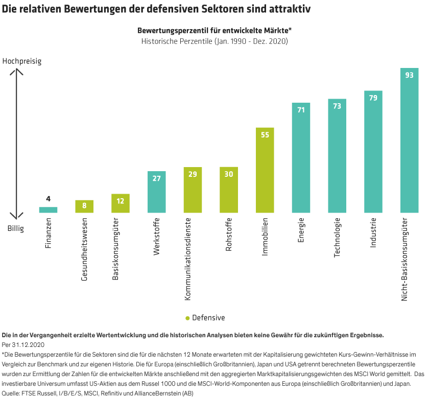 Und auf einem Markt, auf dem die beliebtesten Wachstumsaktien besonders teuer wirken, ist die Konzentration auf den Preis von höchster Priorität. In den defensiven Sektoren wie z. B. Gesundheitswesen, Basiskonsumgüter und Kommunikation liegen die relativen Bewertungen im Vergleich zu ihrer 30-jährigen Historie viel niedriger als z. B. im Technologiesektor und in der Industrie (siehe Abbildung). In den teuren Sektoren können die Anleger auch qualitativ hochwertige Unternehmen auswählen, die zu attraktiven Bewertungen gehandelt werden.