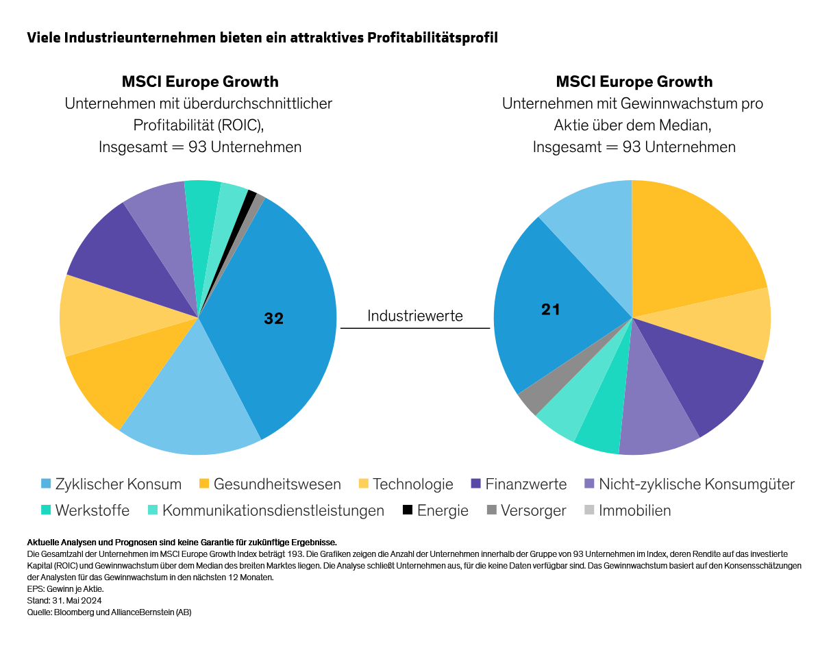 Profitabilitätskennzahlen liefern wertvolle Informationen. Unsere Untersuchungen zeigen, dass es im europäischen Industriesektor mehr Unternehmen mit überdurchschnittlicher Profitabilität und Gewinnwachstum gibt als in jedem anderen europäischen Wachstumssektor (Abbildung). Eine hohe Rendite auf das investierte Kapital ist ein guter Indikator für die Qualität des Unternehmens, die dazu beiträgt, dass das Gewinn- und Cashflow-Wachstum über den Konjunkturzyklus hinweg strukturell über dem Marktdurchschnitt liegt.
