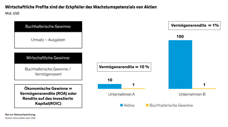 Aber was genau ist damit gemeint? Es gibt viele Maßstäbe, aber zwei grundlegende Definitionen: die buchhalterische Definition und die wirtschaftliche Definition. Die buchhalterischen Gewinne sind die Umsätze eines Unternehmens abzüglich der Ausgaben für Rohstoffe und Arbeit. Ökonomische Gewinne sind buchhalterische Gewinne unter Berücksichtigung der Vermögenswerte, die zur Erzielung dieser Gewinne erforderlich sind – die effektive Nutzung dieser Vermögenswerte ist unseres Erachtens für Aktienanleger von entscheidender Bedeutung. Ökonomische Gewinne werden am besten durch die Vermögensrendite (Return on Assets, ROA) oder die Rendite auf das investierte Kapital (Return on Invested Capital, ROIC) veranschaulicht.