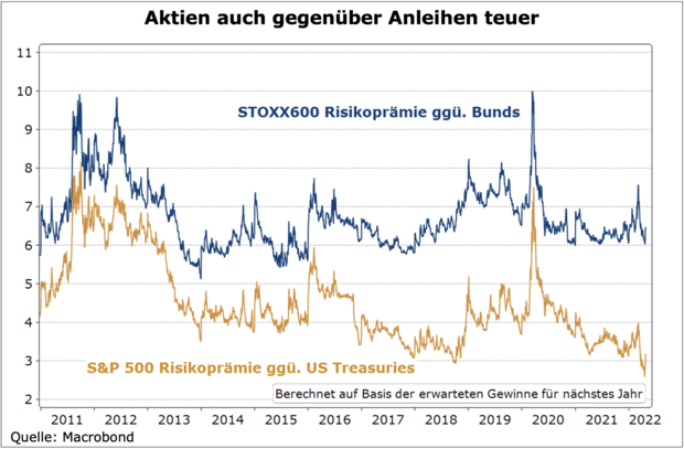 Mit der Kombination aus Zinserhöhungen und Bilanzreduzierung schalten die Notenbanken aus ihrer jahrelang ultraexpansiven Geldpolitik innerhalb kurzer Zeit in den Rückwärtsgang. Dies trifft die Wirtschaft zu einem ungünstigen Zeitpunkt, da Lieferengpässe, der Ukraine-Krieg sowie zunehmende Wachstumsrisiken in China die Konjunktur bereits belasten. Die hohen Inflationsraten lassen der Geldpolitik vermutlich aber keine andere Wahl als so lange die Zinsen zu erhöhen, bis die gewünschte Verlangsamung bei Nachfrage und Investitionen die angebotsgetriebene Inflation bremst. Somit steigen die Rezessionsrisken, zudem belastet der Kaufkraftverlust durch die hohen Inflationsraten die Wachstums- und Gewinnaussichten der Unternehmen. Hinzu kommt, dass gerade in den USA die Aktienmärkte weiterhin recht teuer und die Risikoprämien gegenüber den Rentenmärkten sehr niedrig sind. Zehnjährige US-Staatsanleihen mit knapp drei Prozent Rendite werden zunehmend zu einer Alternative. Der „Sweet Spot“ der Aktienmärkte aus dem Jahr 2021 hat sich in einen „Sour Spot“ gedreht, die Rahmenbedingungen könnten kaum schlechter sein.