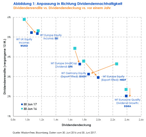 Abbildung 1 stellt die Beziehung, gemessen an der Dividendendeckung , zwischen Dividendenrendite und Nachhaltigkeit für die nach den Dividenden gewichteten Indizes von WisdomTree grafisch dar. Wie sich beobachten lässt, kam es bei der diesjährigen Anpassung zu einer allgemeinen Verbesserung bei der Dividendendeckung, da dieser Faktor die Abnahme bei den Dividendenrenditen im Vergleich zur letztjährigen Anpassung ausglich. Wichtiger ist jedoch der Grad der geopferten Rendite, um eine höhere Dividendendeckung zu erreichen.