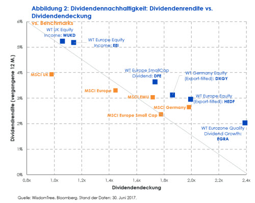 Bei der Equity-Income-Strategie von WisdomTree konzentriert sich das Screening auf Aktien mit hoher Dividende auf den europäischen Märkten, wodurch sich eine Neigung zu defensiven Aktien wie EDF, Sanofi-Aventis, Vodafone und GSK ergibt, die die traditionellen Large-Cap-Mineralölgesellschaften und Bankaktien ergänzen. Im Gegensatz dazu besitzt die exportorientierte Strategie von WisdomTree eine zyklische Neigung mit engerem Aktienkorbfokus auf Exporteure der Eurozone und multinationale Konzerne wie Anheuser-Busch InBev, Unilever, Daimler, BMW, Siemens und BASF.