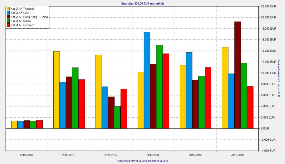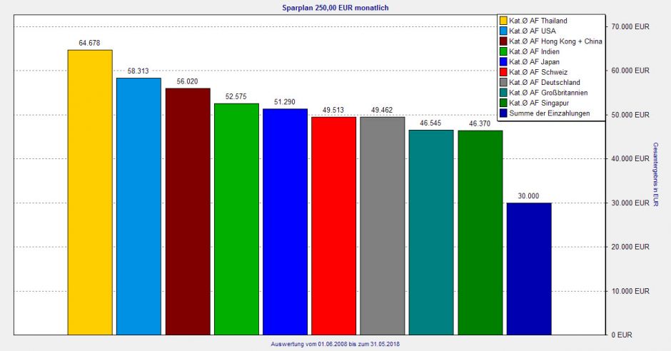 Während die Fußballwelt in den Arenen Russlands den kommenden Weltmeister ausfindig macht, hat FundResearch die besten Länder unter den Aktienfonds gesucht. Die Spielchen anderer Redaktionen gehen wir nicht mit und nehmen nicht nur die WM-Teilnehmerländer in den Blick, sondern alle Länderkategorien in die Analyse, die der Finanzen FundAnalyzer hergibt. Der Betrachtungszeitraum umfasst die letzten zehn Jahre. Stichtag ist der 31.05.2018. Indexfonds werden in der Analyse nicht berücksichtigt. Berechnet wird die Kapitalanlage über einem Sparplan mit monatlichen Ansparraten von 250 Euro. Eine dynamische Beitragsanpassung lassen wir außen vor. Die Summe der Raten beträgt 30.000 Euro.