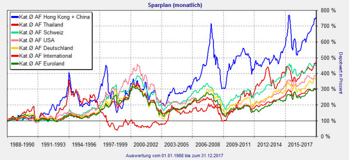 Die Fondsliste der Kategorie Thailand fällt noch schmaler aus als die der AF Hong Kong + China. Nur zwei Fonds sind älter als 25 Jahre, ein einziger, der Amundi Equity Thailand AU Cap (ISIN: LU0158078906) ist seit über 30 Jahren am Markt. Auch er performt leicht überdurchschnittlich. Am Stichtag 31.12.2017 beträgt der Depotwert 383.999 Euro. Die Lücke zwischen der Performance des einzigen dreißigjährigen Fonds und dem Fondsdurchschnitt erklärt sich dadurch, dass in die Berechnung des Kategorie-Durchschnitts auch kürzer laufende Fonds einbezogen werden.