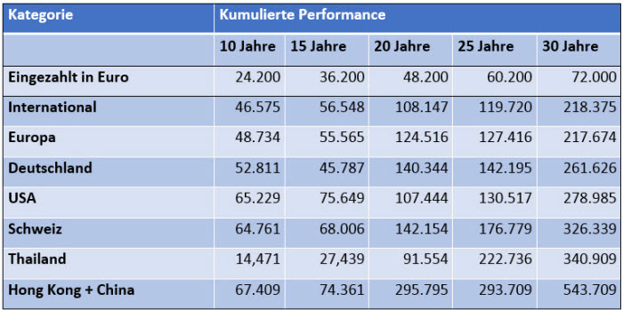 Am lohnendsten wäre eine Allokation in die Fondsgruppe Aktienfonds Hong Kong + China ausgefallen. Wer am 01.01.1988 eingestiegen ist, freut sich über einen Wertzuwachs von 655,15 %. Allerdings fällt die Fondsauswahl für Fonds, die den gesamten Zeitraum abdecken dürftig aus. In der Rangliste des Finanzen FundAnalyzer erscheinen nur sieben verschiedene Fonds. Ganz oben steht der Baring Hong Kong China A $ (ISIN: IE0000829238). Mit einem Plus von 1015,56 % über dem maximalen Berechnungsraum landet er weit vor dem Durchschnittswert seiner Kategorie. Anleger, die vor 30 Jahren ihren Sparplan mit diesem Fonds begonnen hätten, würden heute über einen Depotwert von 803.204 Euro verfügen können. Bei eingezahlten 72.000 Euro entspricht das einem Zuwachs von 731.204 Euro – mehr als das Zehnfache der Ansparsumme. Voraussetzung ist gutes Sitzfleisch: eine Vola von über 25 % halten nicht alle Anleger aus.