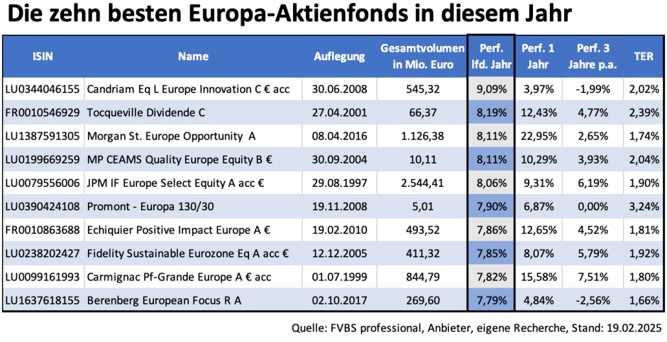 In den ersten sieben Wochen dieses Jahres konnten einige Fondsmanager beeindruckende Erfolge erzielen. An erster Stelle ist hier der Candriam Equities L Europe Innovation C zu nennen, der aktuell die Rangliste der performancestärksten Europa-Fonds in diesem Jahr anführt. Der Tocqueville Dividende C folgt mit einem Prozentpunkt Abstand. Knapp dahinter teilen sich der Morgan Stanley Europe Opportunity A und der MP CEAMS Quality Europe Equity B die Plätze.
