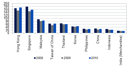 Abbildung 1: Kein vergleichbares Land in Asien ist gegenüber einem Exportrückgang so wenig anfällig wie Indien