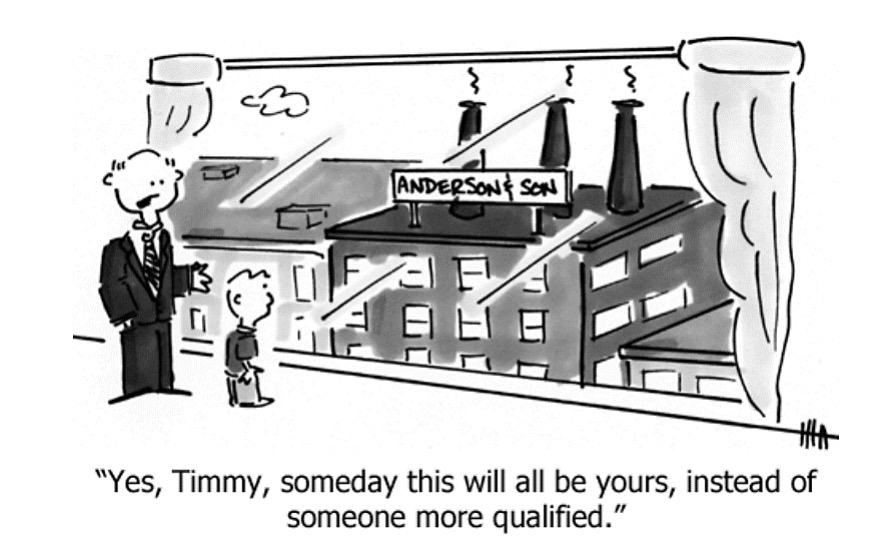 Overlack: Es gibt eine schöne Karikatur, die die Sicht der Allgemeinheit auf Familienunternehmen unseres Erachtens recht treffend darstellt. Die Aussage dieses Cartoons ist: Familienunternehmen werden an inkompetente Erben weitergegeben.