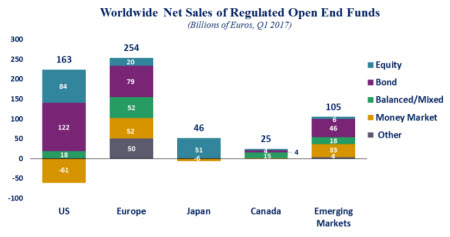 Auf dem europäischen Markt verbuchten Publikumsfonds einen Nettozufluss in Höhe von 202 Mrd. EUR. Die Aktienfonds steuerten mit einem Nettoumsatz von 20 Mrd. EUR den größten Anteil bei. Anleihenfonds verzeichneten Nettozuflüsse in Höhe von 79 Mrd. EUR: Gegenüber dem Vorquartal stiegen die Zuflüsse um mehr als 65 Mrd. EUR. Auch Mischfonds flossen erheblich mehr Mittel zu. Sie beliefen sich auf 52 Mrd. EUR nach 33 Mrd. EUR im vierten Quartal 2016. Im Vergleich dazu legten Geldmarktfonds nur verhalten zu (von 38 Mrd. EUR auf jetzt 52 Mrd. EUR)