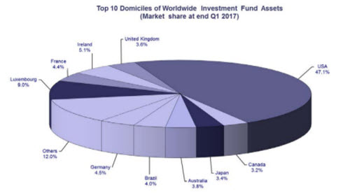 Die verwalteten Vermögen betragen in den USA rund 23,7 Bio. EUR. Das entspricht einem Marktanteil von 47%. Platz zwei nimmt Luxemburg mit fast 4 Bio. EUR Fondsvermögen ein. Auf den Rängen dahinter folgen Irland (2,2 BIO EUR) und Deutschland (1,95 Bio. EUR).