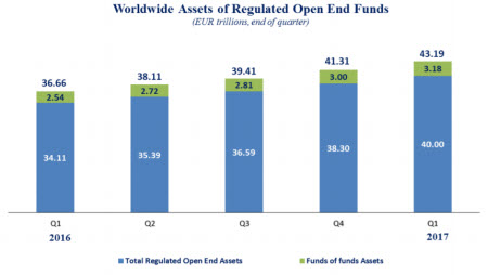 Weltweit sind einer Erhebung der Efama zufolge 43,3 Billionen EUR in Publikumsfonds investiert. Das angelegte Fondsvermögen wuchs im ersten Quartal 2017 von EUR 41,3 Bio. um 1,9 Bio. EUR. Gegenüber dem Vorjahr steigerten sich die AuM um knapp 18%. Zum Ende des ersten Quartals 2016 hatte es noch gut 36,7 Bio. EUR betragen. Zum Vergleich: Im Jahr 2005 hatten Anleger weltweit lediglich 11,8 Bio. EUR in Fonds Investiert.