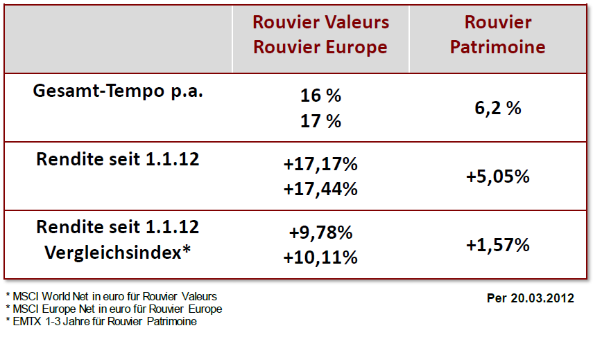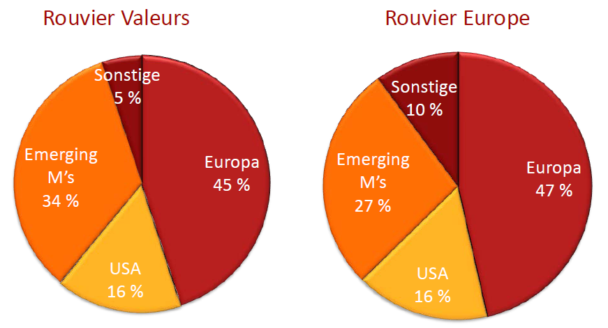 Auch Europa habe die Bedingungen für zurückkehrendes Vertrauen erfüllt. Der Europäische Fiskalpakt, die bestehende Solidarität zwischen den europäischen Staaten (innerhalb der EU durch den ESM, außerhalb durch den IWF) sowie die diese Faktoren begleitende Geldpolitik der Europäischen Zentralbank lässt Rouvier positiv in die nächsten Monate blicken. Diese Aussichten veranlassten Rouvier Associés dazu, sowohl beim Rouvier Valeurs als auch beim Rouvier Europe überwiegend in Europäische Aktien zu investieren. „Da wir momentan von Europa überzeugt sind, haben wir ähnliche Titel in beiden Fonds“, erklärt Linden.