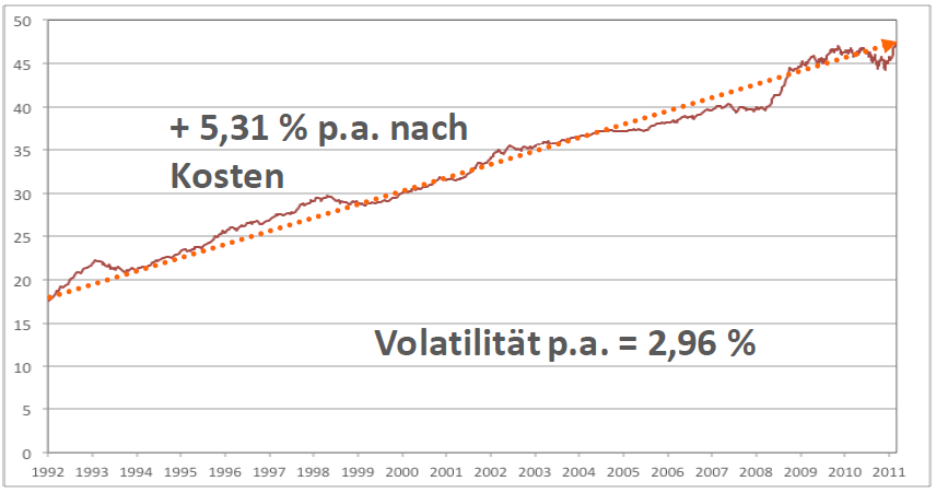 Die Duration des Rentenanteils steuern die Fondsmanager über die Rendite, was zu einer Senkung des Zinsrisikos führe. „Stabilität heißt für uns auch, ein Auge auf die Zinsen zu haben. Je höher der Zinssatz ist, desto länger sind wir bereit Durationen in Kauf zu nehmen“, erklärt Linden. Mehr als zwei Drittel des Portfolios sei zudem investiert in Euro denominierte Anlagen, was das Wechselkursrisiko mindere. Durch die Minimierung dieser Risiken verspricht sich Rouvier eine Stabilitätssicherung für den Fonds. Die maximal 30 Prozent des Fonds, die nicht aus Renten bestehen, sind in Aktien von stabilen Unternehmen mit zuverlässigen Dividenden und vorhersehbarer Geschäftsentwicklung, hybriden Zinsprodukten sowie unterbewerteten Anleihen investiert. Der Rouvier Patrimone weist nach Angaben der Fondsgesellschaft seit 1992 einen durchschnittlichen jährlichen Gewinn von 5,31 Prozent nach Kosten auf. Die Volatilität liege im Jahr durchschnittlich bei 2,96 Prozent.