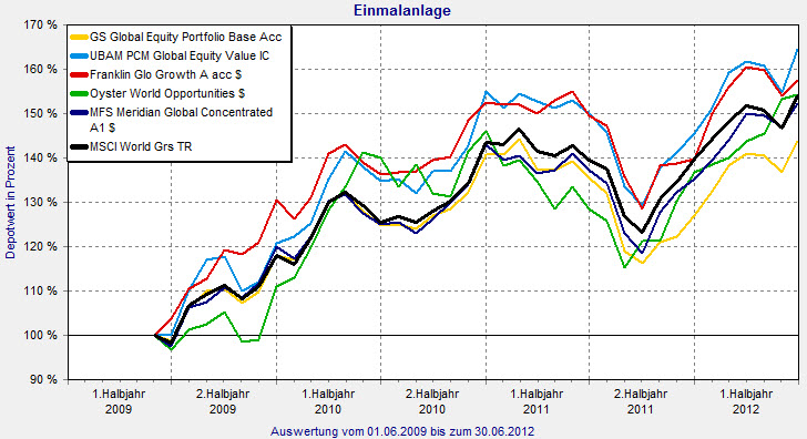 Der beste internationale Aktienfonds im ersten Halbjahr 2012 kommt von Goldman Sachs. Der GS Global Equity Portfolio Base Acc. (ISIN: LU0234571213) verzeichnet in diesem Zeitraum einen Gewinn von 13,16 Prozent. Das Global Equity Team des US-amerikanischen Investmentbank verwaltet ein Fondsvolumen von 13,85 Millionen Euro. Über die vergangenen drei Jahre musste es nur 2011 einen Verlust von 9,72 Prozent hinnehmen. Aber 2011 war für alle fünf Fonds ein Verlustjahr. 2010 stieg der GS Global Equity um 19,41 Prozent und im Jahr 2009 um 25,33 Prozent. Anleger, die seit der Auflegung des Fonds im November 2005 investiert haben, müssen jedoch kumulierte Verluste 3,58 Prozent hinnehmen. Gemeinsam mit dem MFS-Fonds hat der GS Global Equity mit 12,77 Prozent die niedrigste Volatilität. Die Sharpe Ratio von 0,94 stellt aber den schlechtesten Wert des Vergleichs dar. Die TER beläuft sich auf 1,90 Prozent. Zu mehr als der Hälfte (53,8 Prozent) hat das Global Equity Team in Nordamerika investiert. Auf Europa entfallen 30,9 Prozent und auf Japan 8,1 Prozent. Die größten Einzeltitel sind der IT-Riese Apple mit 3,1 Prozent, der Energiekonzern General Electric mit 2,3 Prozent und je 2,1 Prozent entfallen auf das Finanzunternehmen Sumitomo Mitsui Financial, das Versicherungsunternehmen Travelers sowie den Finanzdienstleister JP Morgan Chase.