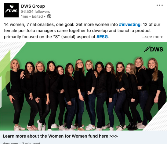 Den neuen DWS Invest ESG Women for Women managen zwölf DWS-Fondsmanagerinnen, die mit ihrem Fokus auf dem S in ESG gezielt Frauen als Anlegerinnen gewinnen möchten.