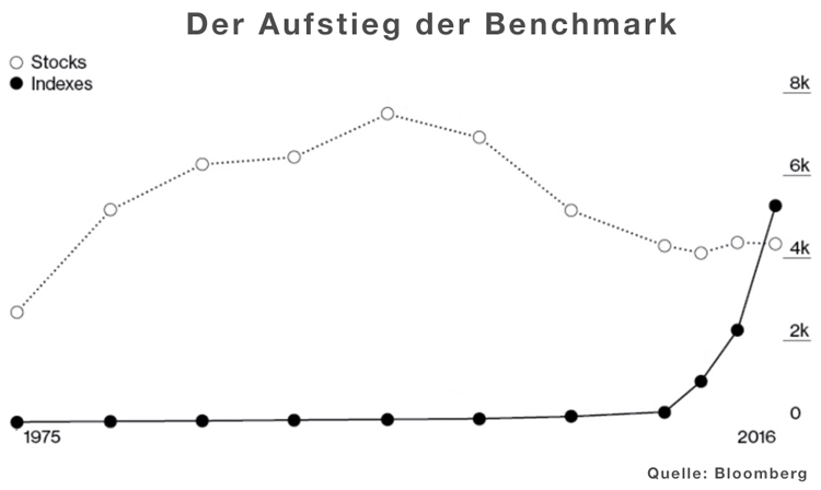 Wie der Nachrichtendienst Bloomberg berichtet, hat die Anzahl der Indizes im vergangenen Jahr zum ersten Mal die Marke von 5.000 überschritten. Gleichzeitig sank die Anzahl der Aktienunternehmen mit Börsennotierung von über 7.000 im Jahr 1995 auf derzeit unter 5.000. Mehr Indizes als Aktien?