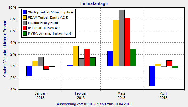 Von allen im der FVBS-Peergroup „Aktienfonds Türkei“ gelisteten Fonds, musste 2013 nur der Strateji Turkish Value Equity (ISIN: LU0611886499) von IPConcept Verluste hinnehmen. Sein Kurs sank in den ersten vier Monaten um 2,60 Prozent. Deutlich besser lief es für das Fondsmanagement-Team des UBAM Turkish Equity (ISIN: LU0500237457) der Schweizer Privatbank Union Bancaire. Der Fonds stieg bis Ende April um fast 13 Prozent und ist damit Top-Performer der Peergroup im Jahr 2013. Auf Platz zwei rangiert überraschenderweise ein Fonds, der €uro-FondsNote 5 trägt: Der Istanbul Equity Fund (ISIN: LU0093368008), ebenfalls von IPConcept. Im vergangenen Jahr einem Plus von 36,93 Prozent noch der „schwächste“ Performer der Peergroup, kommt er im laufenden Jahr bisher auf eine Wertsteigerung von 12,56 Prozent. Bester Fonds mit der €uro-FondsNote 1 ist der HSBC GIF Turkey (ISIN: LU0213961682). Mit einem Plus von 11,75 Prozent rangiert er auf Platz 4 der Vergleichsgruppe. Weiterhin nach oben geht es auch für den „Below the Line“-Fonds MYRA Dynamic Turkey Fund (ISIN: LU0778826858). Zwar kommt er 2013 bisher nur auf ein vergleichsweise geringes Plus von 4,07 Prozent. Doch seit seiner Auflegung im Juli 2012 konnten die Fondsmanager Gökhan Kula und Türkay Onuk seinen Wert um 14,10 Prozent steigern.