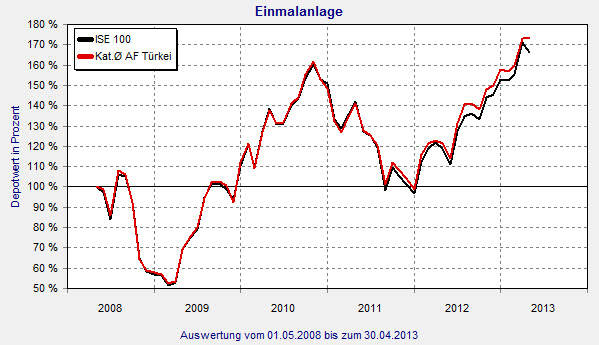 Bereits in der vergangenen Woche hatte die türkische Zentralbank unerwartet stark den Leitzins um 50 Basispunkte auf 4,5 Prozent gesenkt, um die Wirtschaft anzukurbeln. Die Lira wertete durch die Maßnahme ab, setzte den Trend der vergangenen Tage fort und notiert derzeit bei knapp EUR 0,42. Diese Impulse dürften sich auch auf den Aktienmarkt auswirken. Der ISE 100 stieg seit Januar um über 10.000 Punkte auf derzeit 91.260 Punkte – ein Plus von über 17 Prozent. In der vergangenen Woche erreichte er mit ca. 92.500 Punkten sein Allzeithoch. Auch die türkischen Aktienfonds setzen ihren Höhenflug fort (FundResearch berichtete). Bis zum Stichtag 30. April 2013 kletterte der Durchschnitt der FINANZEN FundAnalyzer (FVBS)-Peergroup „Aktienfonds Türkei“ um 9,7 Prozent. DWS-Fondsmanager Sebastian Kahlfeld warnt jedoch in der Börsen-Zeitung vor zu großen Gewinnerwartungen: „Der Aktienmarkt hatte das Upgrade bereits vorweggenommen. Man sollte daher jetzt keine garantierten Kursgewinne erwarten.“