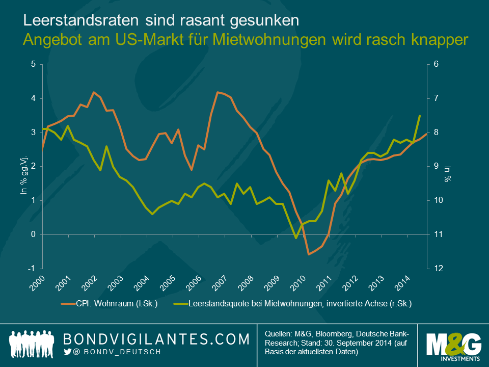 Darüber hinaus könnten die Wohnungsmieten angesichts der aktuellen Leerstandsraten in den kommenden 12 Monaten um 4 bis 4,5 Prozent nach oben klettern. Und da die Mieten etwa 40 Prozent der allgemeinen Inflation der Verbraucherpreise ausmachen, könnten höhere Mieten damit auch die jährliche Teuerungsrate deutlich nach oben treiben.