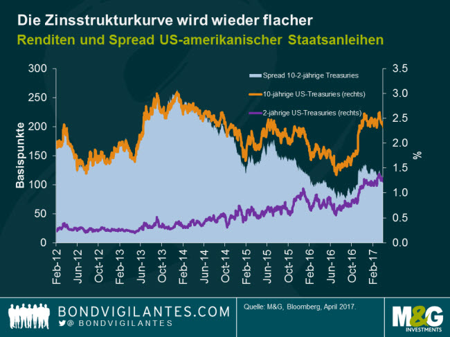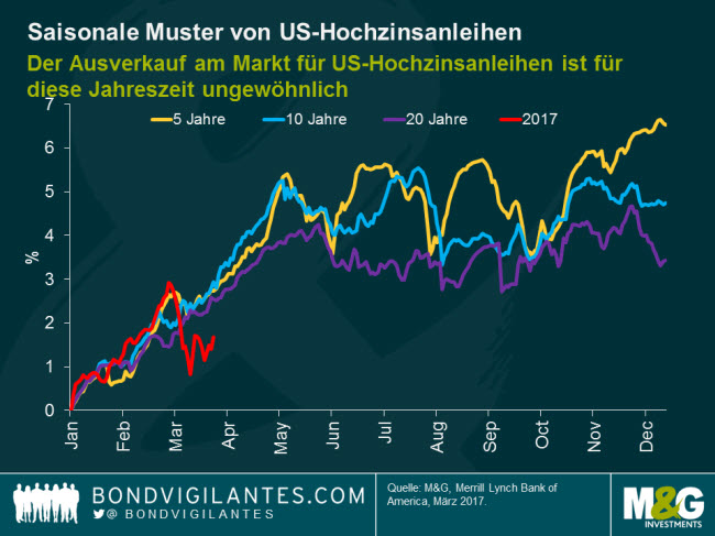 Mit Blick in die Zukunft dürften die internationalen politischen Risiken auch weiterhin im Fokus der Rentenmärkte bleiben. Die Wahlen in Frankreich sowie die Fähigkeit von Donald Trump, seine ambitionierte politische Agenda umzusetzen, dürften für kurzzeitige Schwankungen der Anleihenrenditen verantwortlich sein. Trotz dieser Tatsache legt der solide Ausblick für das weltweite Wirtschaftswachstum eine pessimistische Prognose für die Staatsanleihenmärkte in den USA und in Europa für das zweite Quartal nahe. In den USA sieht man eine Unterbewertung seitens des Marktes im Hinblick auf die Möglichkeit einer restriktiveren Fed und einer höheren inländischen Inflation. In Europa könnte die Europäische Zentralbank aufgrund des besser werdenden gesamtwirtschaftlichen Umfelds und des höheren Inflationsniveaus die Rhetorik bezüglich zukünftiger Maßnahmen verändern und mit einer aggressiveren Reduzierung der Vermögenswertkäufe beginnen, was zu höheren Zinsen am langen Ende sowie zu steileren Renditekurven führen würde. Kommt zu diesen Faktoren nun noch das Überraschungspotenzial der BoJ hinzu, reduzieren plötzlich drei wichtige Zentralbanken die Stimulusmaßnahmen schneller als bisher angenommen. Sollte dieses Szenario Realität werden, wird es für risikobehaftete Anlagen wie Hochzinsanleihen schwierig werden, auch weiterhin die Erträge zu generieren, die Anleger seit dem US-Wahlergebnis gewohnt sind.