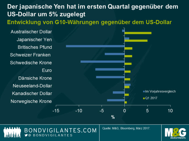 Trotz der Yen-Aufwertung im ersten Quartal gehen Experten nach wie vor davon aus, dass sich der Yen gegenüber dem Dollar abschwächen wird, da das Zinsgefälle zwischen Japan und den USA zunehmen dürfte. Die Bank of Japan (BoJ) wird vermutlich weiterhin die Politik der Zinskurvenkontrolle verfolgen und die Fed wird aller Voraussicht nach die Zinsen weiter anheben. Es gibt jedoch mehrere Gründe dafür, dass die Erwartungshaltung mit Blick auf die japanische Geldpolitik womöglich verändert werden sollte. Erstens entwickelt sich die japanische Wirtschaft gut und die aktuellen Wirtschaftsdaten bestätigen eine höhere Industrietätigkeit. Zweitens ist der Arbeitsmarkt bei einer Arbeitslosenquote von lediglich 2,8% extrem angespannt. Damit sind die Aussichten sowohl für das Lohn- als auch das Konsumwachstum gut und dementsprechend dürften die Ausgaben für langlebige Gebrauchsgüter steigen. Drittens dürfte die Fiskalpolitik 2017 leicht expansiv ausfallen und der Schwerpunkt der Ausgaben dürfte auf öffentlichen Investitionen sowie dem Geldtransfer an die privaten Haushalte liegen. Zu guter Letzt wird sich die japanische Exportindustrie aufgrund des Aufschwungs des globalen Wachstumszyklus und der anhaltend starken Nachfrage aus China und den USA auch weiterhin gut entwickeln. Die Reaktion der BoJ auf den besseren Wirtschaftsausblick dürfte aller Wahrscheinlichkeit nach eine Anhebung ihres Ziels für die langfristigen Anleihenrenditen von 0% auf 0,1%-0,2% im Laufe des Jahres sein. Sollte der globale Aufschwung Bestand haben und die Inflation aufgrund steigender Löhne zunehmen, dann könnte die BoJ im Jahr 2017 die Überraschung unter den Zentralbanken sein.