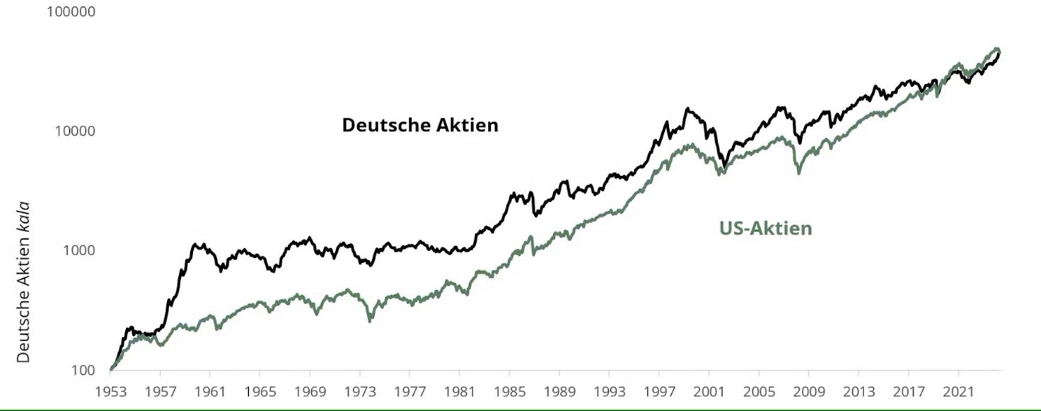 Quelle: Carmignac, Bloomberg, April 2025. US-Aktien: S&P 500 von 1953 bis 1990 und S&P 500 bei Wiederanlage der Dividenden von 1990 bis 2025. Deutsche Aktien: DAX ab 1959 und R. Stehle und M. Schmidt „Performance deutscher Aktien 1954-2013“, zuvor bis 1959.