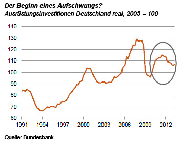 Diese Anpassung hat stattgefunden, in den einzelnen Regionen freilich mit unterschiedlicher Konsequenz. Jetzt kommt sie zu Ende. Das ist es, was den Aufschwung treibt. Es begann mit den USA. Dort hat die Wirtschaft schon Anfang des Jahres kräftig Fahrt aufgenommen. Es wurde nur durch die fiskalpolitischen Querelen gebremst. In Großbritannien hat sich das Wachstum im zweiten und dritten Quartal deutlich beschleunigt (auf eine annualisierte Wachstumsrate von über 3 %). Im Euroraum dauerte es etwas länger. Hier war der Anpassungsbedarf bei vielen Mitgliedern des Euros aber auch größer. Da wird die Karenzzeit erst 2014 oder 2015 überstanden sein.