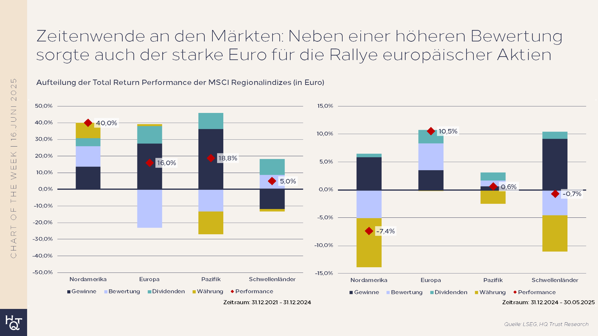 Die Aktienmärkte erleben 2025 einen Wendepunkt, bei dem Europa die USA überflügelt. Die detaillierte Analyse von HQ Trust zeigt, wie wichtig die Wechselwirkungen zwischen Bewertungen, Unternehmensgewinnen und Währungseffekten sind. Anleger sollten sich der verschiedenen Faktoren bewusst sein, die die Performance beeinflussen, und ihre Strategien entsprechend anpassen. (jk)