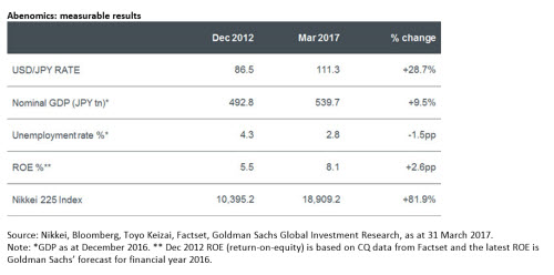 It has been more than four years since Shinzo Abe was elected Prime Minster of Japan, ushering in the era of Abenomics, based upon the ‘three arrows’ of monetary easing, fiscal stimulus, and structural reforms aimed at injecting new life into the moribund Japanese economy. Throughout this period we have been monitoring the progress of these policies and can now conclude that they have produced positive results. Abenomics’ positive scorecardIn our view, Abenomics is delivering quantifiable positive changes to the Japanese economy and its stock market. The first wave of monetary easing has seen the US dollar/yen exchange rate rise by almost 30%. Nominal GDP, meanwhile, has risen 9.5%; the unemployment rate has fallen from over 4% to under 3% and the return-on-equity of the Nikkei Index has increased from 5.5% to 8.1%. Investors in Japanese equities seem to have a favourable view of Abenomics too with the Nikkei 225 Index up 82%. (All figures relate to the period since Abenomics was introduced ie. December 2012 to March 2017).