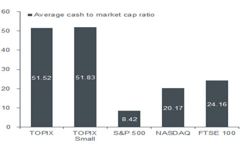 Meanwhile, corporate governance measures, including the introduction of a Corporate Governance Code in 2015 to more clearly align management with shareholder interests, have also had a measurable effect on shareholder returns, either through share buybacks, which reached a record high in 2016, or dividends, which have been steadily rising since 2012. Change is afootNaturally, cultural change takes time. Japanese corporates continue to hoard cash. The average cash-to-market-capitalisation ratios for the TOPIX and the TOPIX Small indices are at over 50%, compared with less than 10% for the S&P 500, under 20% for the Nasdaq and just over 24% for the FTSE 100 (see chart below).