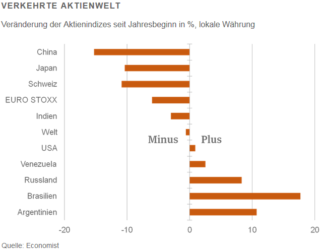 Auch wenn man sich die Struktur innerhalb der einzelnen Ländergruppen anschaut, zeigen sich viele Ungereimtheiten. Nehmen Sie Brasilien. Das Land steckt in einer tiefen Rezession. Es gibt soziale Unruhen. Die Staatspräsidentindroht abgesetzt zu werden. Und der Aktienindex Bovespa? Er hat seit Jahresbeginn um 18 % zugelegt. Oder Russland. Es leidet unter den niedrigen Ölpreisen und den Sanktionen des Westens. Die reale Wirtschaftsleistung geht stark zurück. Gleichwohl hat der Aktienindex RTS um 8 % zugelegt. Ähnlich in Venezuela mit einem Plus von 2 %.