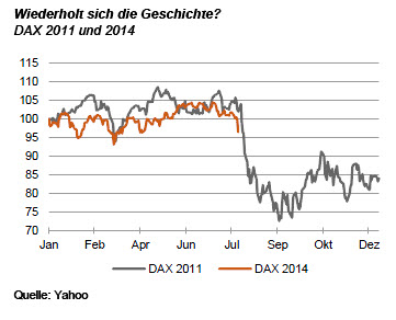 Der Kurseinbruch 2011 hatte zwei Ursachen. Das eine war die Verschlechterung der Konjunktur zur Jahresmitte. Das ist ganz ähnlich wie heute. Der Unterschied besteht nur darin, dass die Wachstumsschwäche damals weltweit war. In den USA gab es zum Teil sogar Rezessionsängste. Diesmal ist nur Europa betroffen, insbesondere Deutschland. In den USA geht es weiter kräftig nach oben. Hier schneidet 2014 also besser ab als 2011.