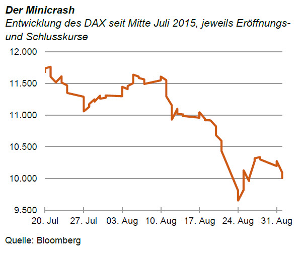 Trotzdem lohnt es sich, sich die Sache etwas näher anzusehen. Einige sagten, der "schwarze Montag" sei die lang erwartete Trendwende. Wir stünden vor einer längerfristigen Talfahrt wie in den Jahren 2000 oder 2007. Da wäre es natürlich falsch zu investieren. Für diese These sind jedoch keine fundamentalen Gründe auszumachen. Die Konjunktur in Europa läuft. Die Gewinne der Unternehmen steigen. Sie waren im zweiten Quartal so gut wie selten. Die Europäische Zentralbank stellt jeden Monat EUR 60 Mrd. zur Verfügung. Allenfalls in den USA könnte man angesichts der Diskussion über eine Zinserhöhung an eine Trendwende denken. Dort war der Einbruch der Aktienmärkte jedoch wesentlich geringer als in Europa.