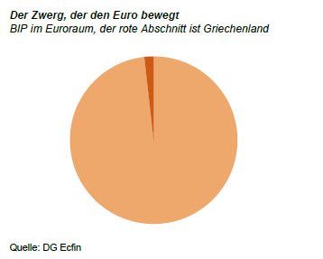Wenn es zu einem "Grexit" kommt, erwartet der bekannte amerikanische Ökonom Barry Eichengreen in Anlehnung an die fatale Pleite der Investmentbank Lehman Brothers 2008 ein "Lehman zum Quadrat". Das ist übertrieben. So schlimm kommt es nicht. Griechenland ist ein kleines Land. Es macht weniger als 2 % des BIP des Euroraums aus (siehe Grafik).