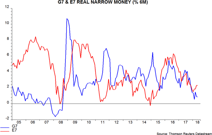 Our key forecasting indicator is the six-month growth rate of real (i.e. inflation-adjusted) narrow money in the G7 countries and seven large emerging economies (the “E7”)*. Real money growth peaked most recently in June 2017, falling to a nine-year low in February 2018. Allowing for the typical nine-month lead, this suggested that global economic growth would peak around March 2018 and fade into the second half of the year.