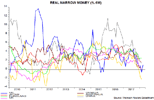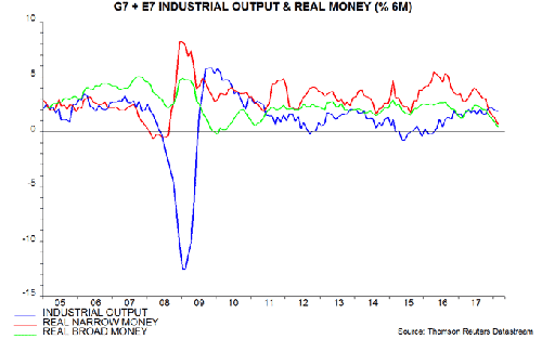 At the opposite end of the range, real narrow money growth remains respectable by historical standards in Japan and Euroland but has nonetheless fallen significantly since mid-2017. In contrast to the US and China, moreover, there are no strong grounds for expecting a monetary rebound. The recent success in Italian elections of parties advocating fiscal loosening is likely to strengthen the ECB’s resolve to wind down QE by end-2018.