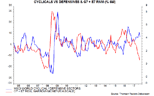 Country-level monetary trends, therefore, are not currently giving strong signals for regional / country selection. The main strategy suggestion from our analysis is to reduce exposure to cyclical equity market sectors in favour of defensive sectors. This follows from the forecast of a near-term global economic slowdown and is also directly implied by the low level of global real narrow money growth – fourth chart.