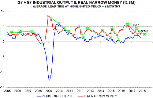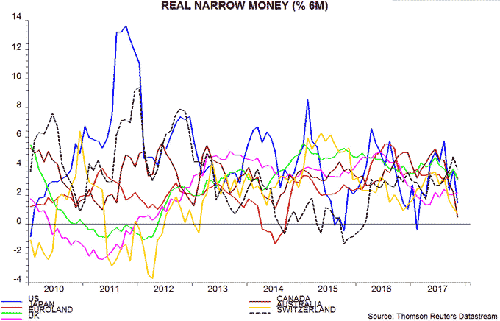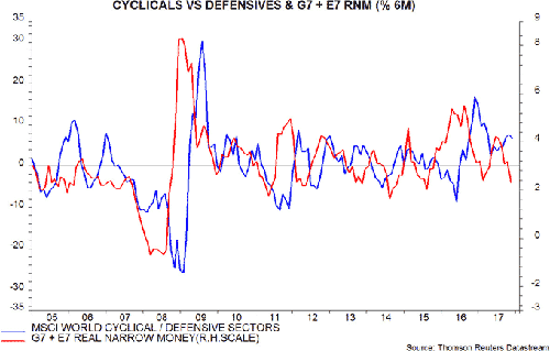 World cyclical equity market sectors outperformed defensive sectors by 30% between mid-2016 and end-2017. Outperformance is normal during stockbuilding cycle upswings but defensives usually regain ground during the downswing phase. The recent fall in global real narrow money growth also argues for increasing defensive sector exposure – eighth chart.