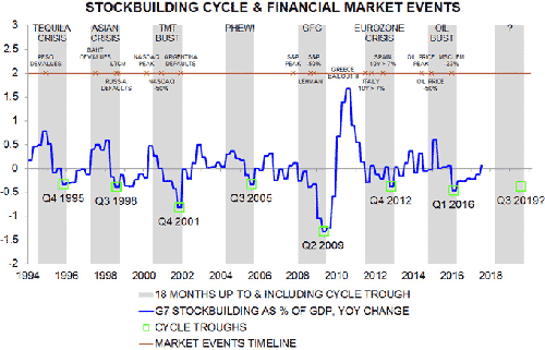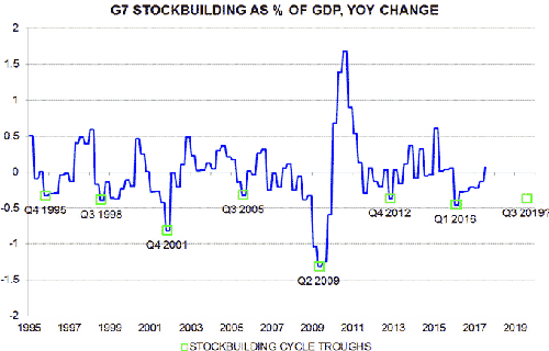 Secondly, an upswing in the US / global stockbuilding cycle has been an important driver of recent economic strength but we expect the cycle to top out in the first half of 2018 and act as a drag on growth later in the year and in 2019.