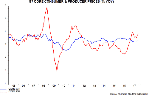 G7 core producer price inflation has picked up over the past 18 months as firms have passed on rising input costs and widened margins in response to strong demand. Core producer price trends often lead consumer prices – third chart.